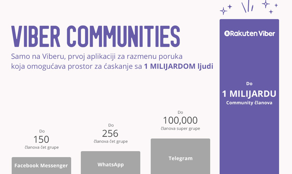 Viber, jedna od vodećih globalnih aplikacija za razmenu poruka, danas je objavila pokretanje Viber Communities (“Komjunitiz” – Zajednice) – čime je postala prva aplikacija ovog tipa koja nudi prostor za četovanje u kome će milijardu korisnika nesmetano moći da razmenjuje poruke i sve vrste sadržaja. Dok je trenutno stanje na tržištu takvo da ograničava grupne četove na stotine ili hiljade korisnika, Viber to prevazilazi i pruža korisnicima jedinstvenu mogućnost da se na ovaj način povežu sa sagovornicima iz celog sveta na nivou koji je bez presedana u industriji aplikacija za razmenu poruka – sa milijardu korisnika u jednom jedinom grupnom četu.