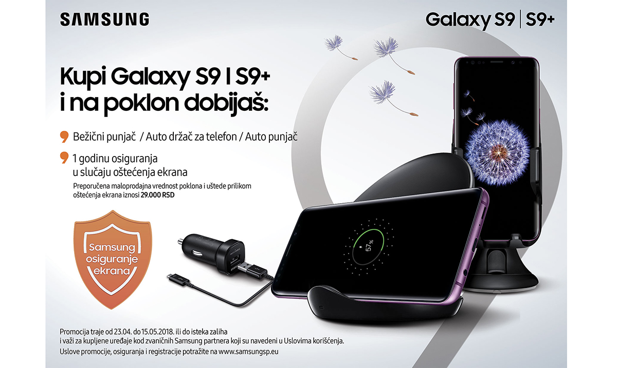 Svakome od nas desilo se da u nekom trenutku ispusti telefon. Da možda ošteti, razbije ili ogrebe ekran. Kako bi svojim korisnicima pružila mogućnost da maksimalno uživaju u svom telefonu, bez razmišljanja o ovakvim situacijama, kompanija Samsung kupcima novih uređaja Galaxy S9 ili S9+ nudi pravo na dodatno osiguranje od godinu dana, u slučaju oštećenja ekrana. Uz osiguranje, ova kompanija daje bežični punjač, auto držač za telefon i auto punjač.