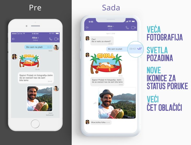 • da koriste veće i vidljivije čet oblačiće: Kako biste pomnije i pažljivije pratili sadržaj četa, Viber predstavlja svetliju paletu boja i veće čet oblačiće, kako bi se sadržaj bolje video na ekranu i olakšao korisnicima da sve vide na prvi pogled, i…