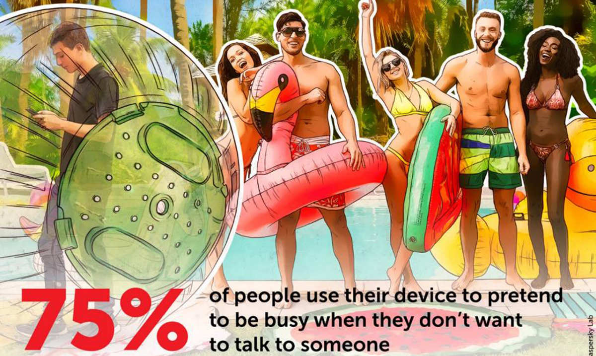 Istina je da nam naša upotreba uređaja pomaže da izbegnemo ćaskanje ili čak ljubaznost prema onima oko nas, a nova istraživanja kompanije Kaspersky Lab su otkrila da 72% ljudi koristi svoj uređaj kada ne znaju šta da rade u nekoj društvenoj situaciji. Uređaji takođe služe da ljudima odvrate pažnju čak i kada ne pokušavaju da izgledaju zauzeto ili da izbegnu nečiiji pogled. Čak 46% ljudi priznaje da svakodnevno koristi uređaje kako bi ubili vreme i 44% njih ih koristi kao svakodnevnu distrakciju.
