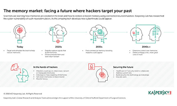 U budućnosti će sajber-napadači moći da eksploatišu memorijske implante kako bi krali, špijunirali, promenili ili kontrolisali ljudsku memorju. I dok su najradikalnije pretnje nekoliko decenija daleko, osnovna tehnologija već postoji u obliku uređaja za dubinsku stimulaciju mozga. Naučnici uče kako se uspomene stvaraju u mozgu i kako se mogu ciljati, obnoviti i poboljšati pomoću takvih implantata. Međutim, postoje ranjivosti u povezanom softveru i hardveru koje se moraju rešiti da bismo bili spremni za pretnje koje dolaze u budućnosti, saznajemo u novom izveštaju istraživača kompanije Kaspersky Lab i grupe za funkcionalnu neurohirurgiju sa univerziteta u Oksfordu koji je predstavljen na godišnjoj konferenciji Kaspersky Next u Barseloni.