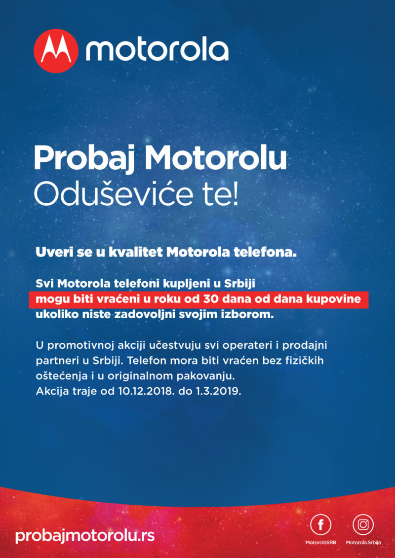 Kompanija Motorola odlučila je da svim kupcima svojih telefona omogući veća prava nego što im zakon o zaštiti potrošača garantuje. Pod okriljem kampanje „Probaj Motorolu“, svi koji kupe bilo koji Motorola mobilni telefon u periodu od 10.12. do 1.3.2019. i u 30 dana od dana kupovine zaključe da nisu zadovoljni svojim izborom, moći će da uređaj, fizički neoštećen i u originalnom pakovanju, vrate na prodajno mesto gde su ga kupili. Akcija će važiti kod svih operatera i prodajnih partnera u Srbiji.