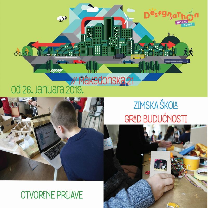 Zimska škola dizajna i novih tehnologija „Grad budućnosti“ namenjena je deci uzrasta od 9 do 13 godina, održava se u Makedonskoj 21 (prostorije Impact Hub-a) subotom od 11 do 14h. Datumi su 26. januar, 2. februar, 9. februar i 16. februar.