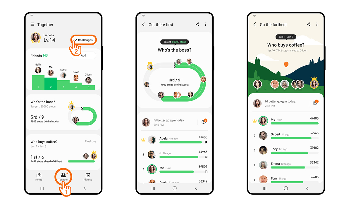 Group Challenge[2] opciju korisnici će moći da koriste unutar Together odeljka aplikacije Samsung Health, nakon kreiranje grupe čiji članovi će se potom takmičiti u tome ko će napraviti najviše koraka u određenom vremenu ili ko će prvi dostići zacrtani broj koraka. Ova mogućnost ne zahteva da i drugi učesnici nužno imaju instaliranu Samsung Health aplikaciju na svojim pametnim uređajima, pa tako korisnici lako mogu pozvati svoje prijatelje, porodicu ili kolege na zdravi izazov.