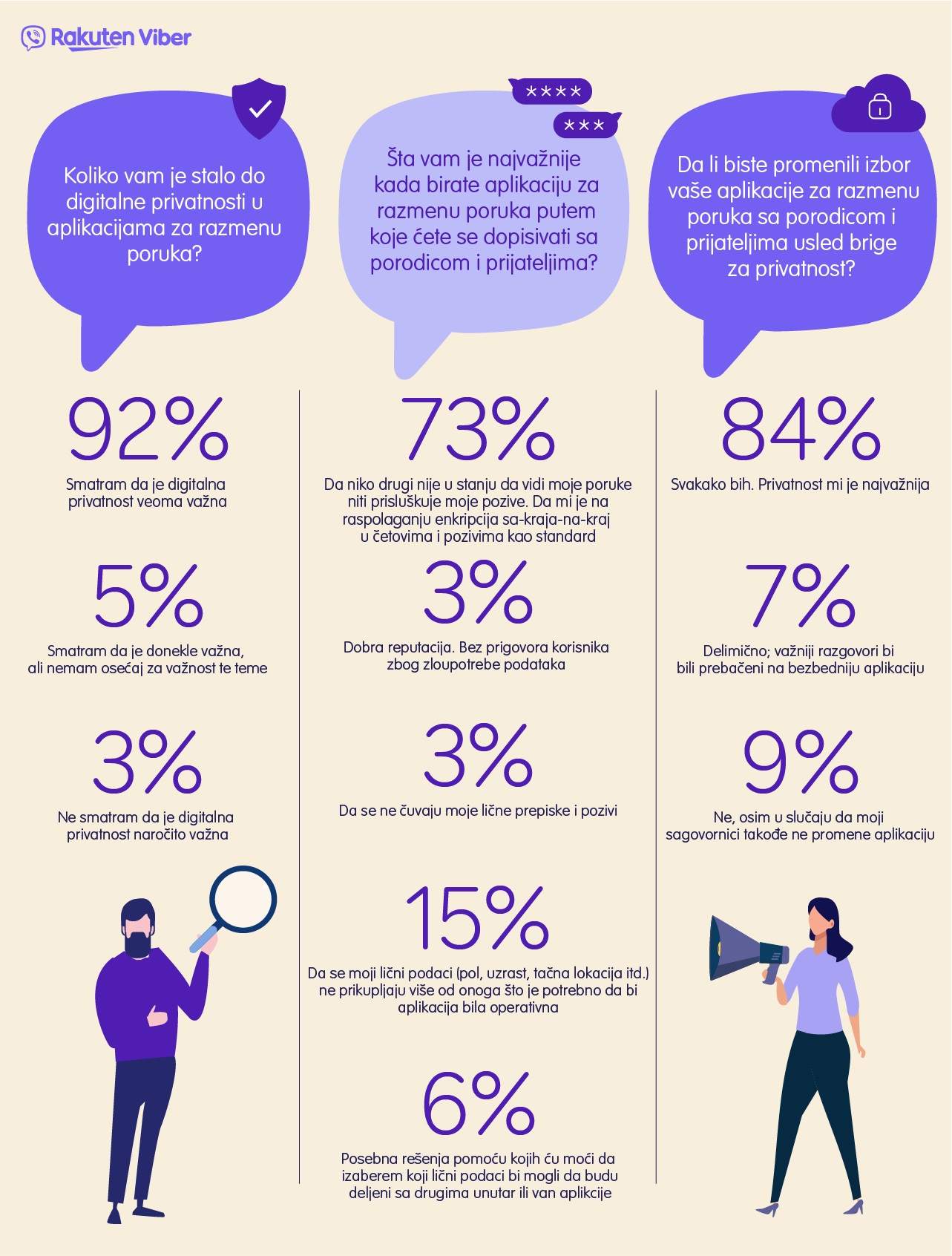 “Ova anketa nam je pokazala da privatnost nikada ne sme da trpi zbog bilo čega drugog, posebno u vremenima kada je strah od prisluškivanja privatnih razgovora u svrhu profita sve veći”, kaže Đamel Agaoua, generalni direktor kompanije Rakuten Viber i dodaje: “Budući da je privatnost podataka najvažnija našim korisnicima, ona je takođe i nama apsolutni prioritet, te ćemo nastaviti da ljudima širom sveta obezbeđujemo platformu na kojoj će bezbedno moći da vode privatne razgovore.”