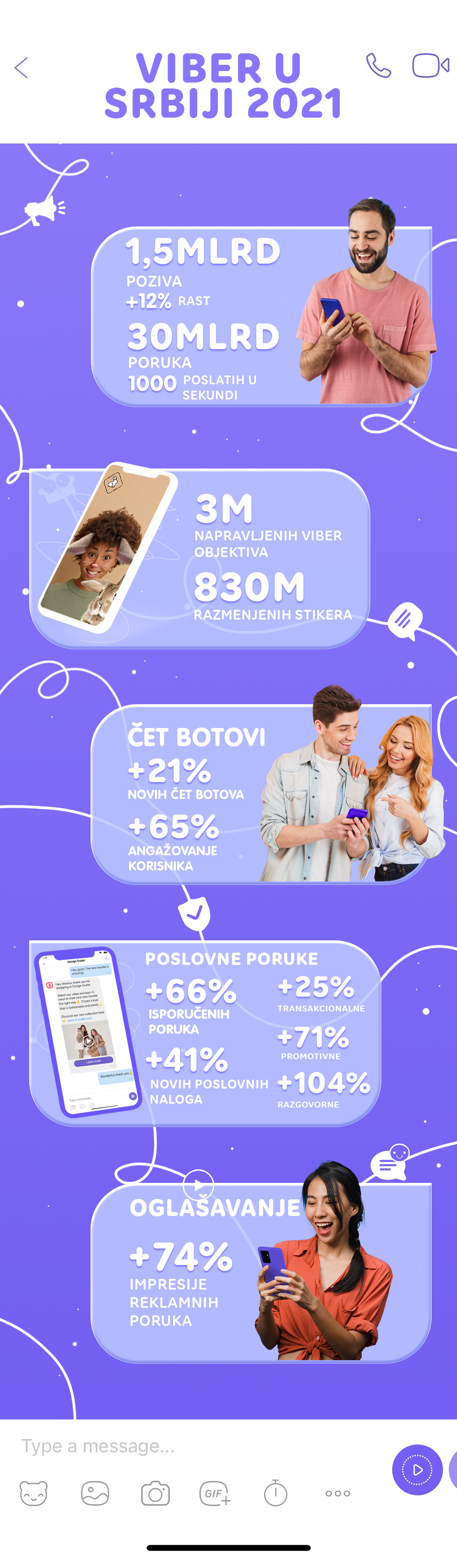 I konačno – brendovi su u mogućnosti da plasiraju svoje reklamne sadržaje kako bi povećali njihovu primećenost i privukli nove korisnike. Prošle godine, ukupni broj impresija Viberovih reklama se povećao za 74% u Srbiji i 70% na globalnom nivou, čime je na najbolji način potvrđeno značajno interesovanje od strane oglašivača. Među vodećim vertikalama u smislu rezultata našli su se zdravlje i fitnes – sa rastom od 90%, energetika sa rastom od 56% i transportne usluge – koje su porasle za 51%. Primećen je i značajno učešće novih kategorija oglašivača na Viberu – poput firmi za zapošljavanje i manjih lokalnih biznisa, čime se vidi jasan uticaj pandemije na poslovni ambijent i tržište rada.