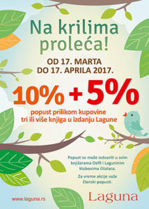 Za vreme akcije „Na krilima proleća“ važiće i članski popusti u svim Laguninim klubovima i redovni popust od 15% u knjižarama Delfi SKC i „Miloš Crnjanski“.