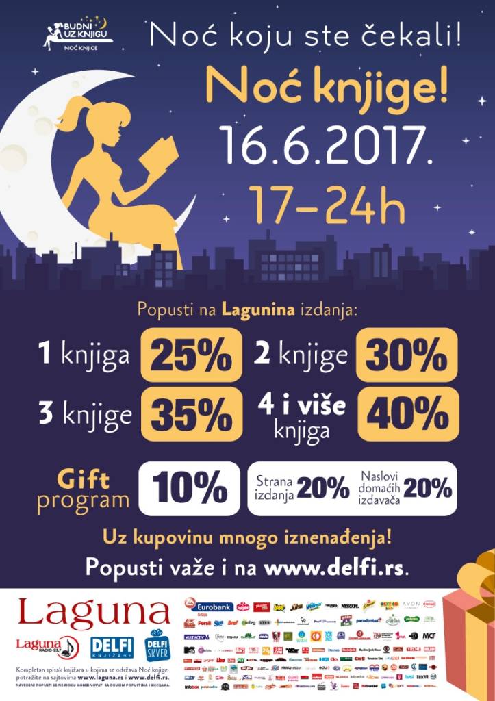 Napomena: U toku Noći knjige članski popusti Laguninog kluba čitalaca i količinski popusti neće se sabirati sa akcijskim, odnosno sa popustima koji će važiti samo za Noć knjige.