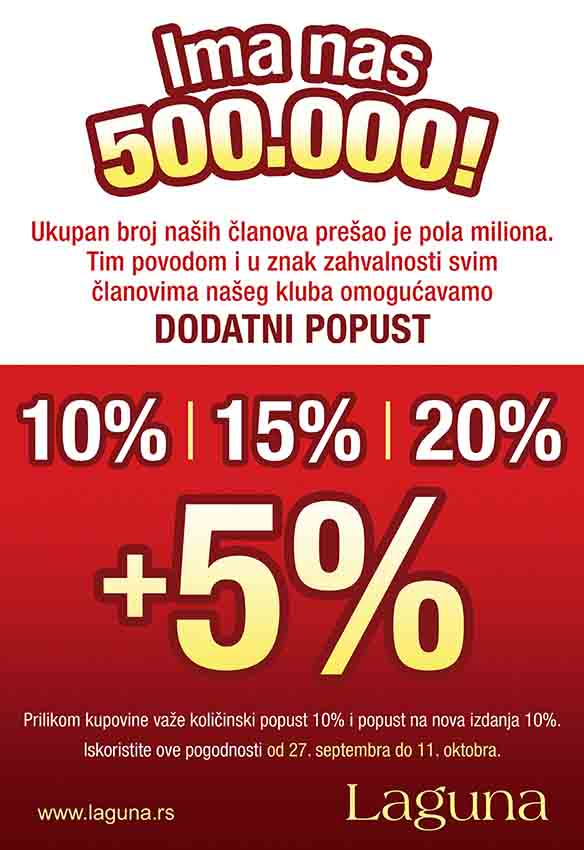 U periodu od 27. septembra do 11. oktobra prilikom kupovine u knjižarama Delfi i Laguninim klubovima čitalaca, iskoristite dodatnih 5% članskog popusta uz postojeće, kao i 10% količinskog i popust na nova izdanja.