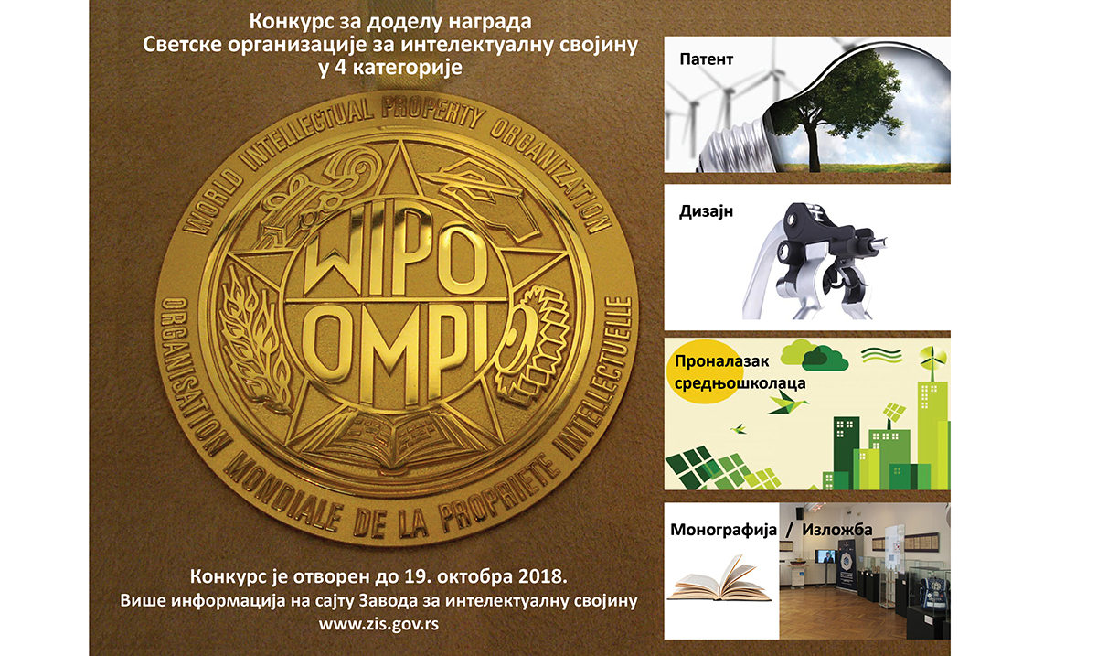Zavod za intelektualnu svojinu Republike Srbije sa zadovoljstvom obaveštava javnost da je otvoren konkurs za takmičenje za dodelu nagrada Svetske organizacije za intelektualnu svojinu (WIPO) za konkretne doprinose ostvarene tokom 2018. godine, u četiri različite kategorije, i to: pronalazač ili grupa pronalazača za patent, pravna lica za registrovan industrijski dizajn, autor za monografsko delo/studijsku izložbu u oblasti društveno-humanističkih nauka, i učenik ili grupa učenika srednje škole za pronalazak. Takmičenje organizuje Zavod za intelektualnu svojinu pod pokroviteljstvom Svetske organizacije za intelektualnu svojinu.