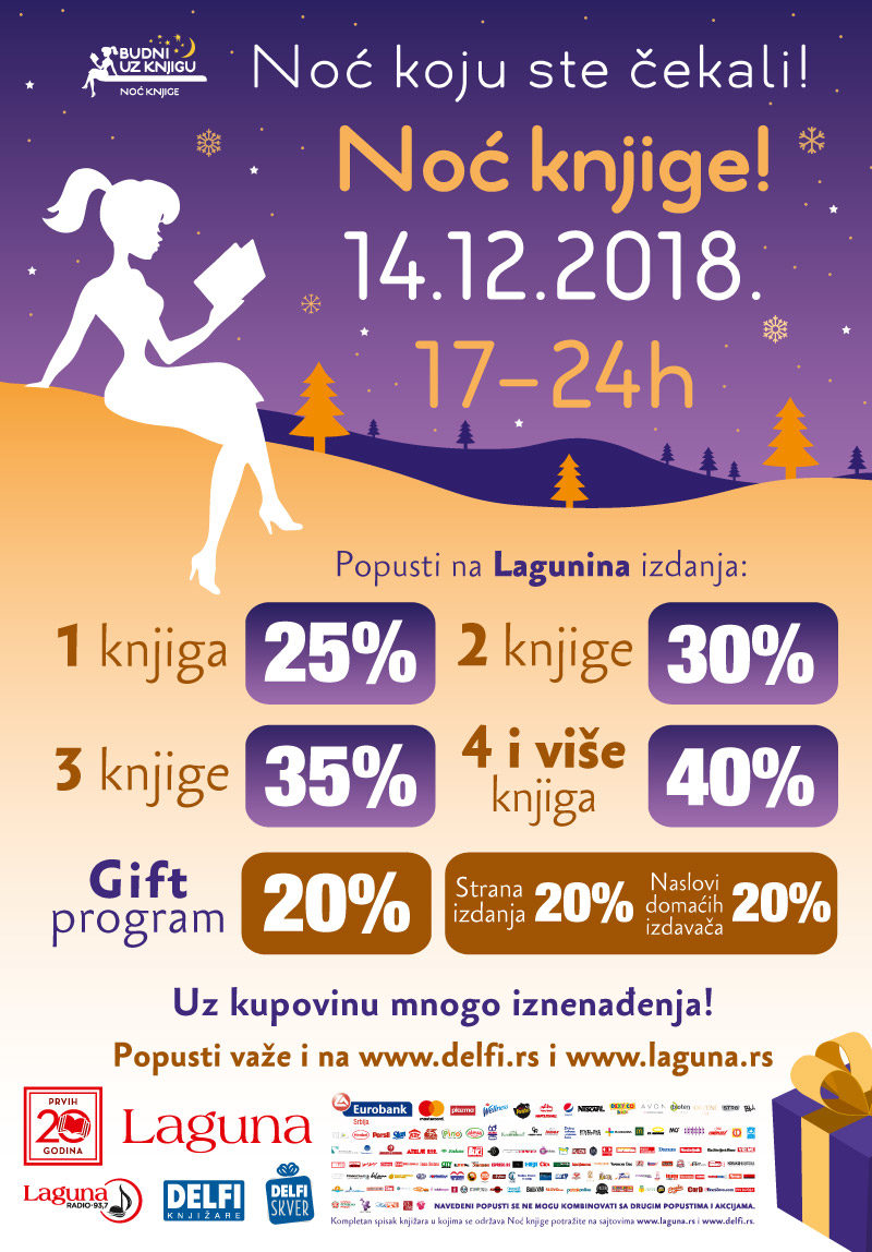 I ova Noć knjige, koja će se održati u petak 14. decembra od 17 sati do ponoći u Laguninim klubovima čitalaca i knjižarama Delfi, doneće čitaocima brojne novite domaće i svetske književnosti, koji će biti dostupni po znatno nižim cenama.
