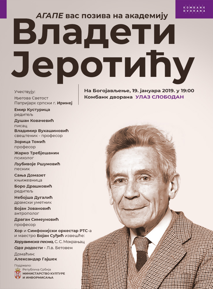 Njegova Svetost Patrijarh srpski gospodin Irinej otvoriće svečanu Akademiju posvećenu akademiku Vladeti Jerotiću koja će biti održana na Bogojavljenje 19. januara u 19:00h u Kombank Dvorani.