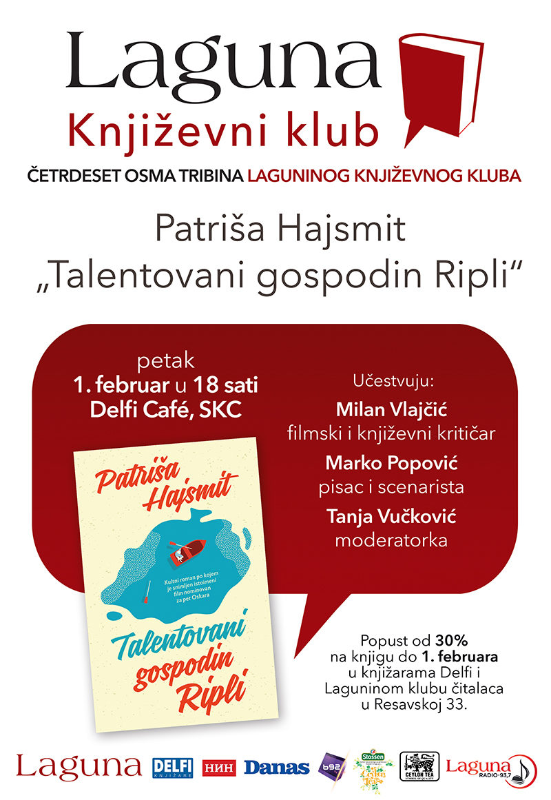 Četrdeset osma tribinu Laguninog književnog kluba održaće se u petak 1. februara od 18 sati u knjižari Delfi SKC, a biće reči o romanu Patriše Hajsmit „Talentovani gospodin Ripli“.