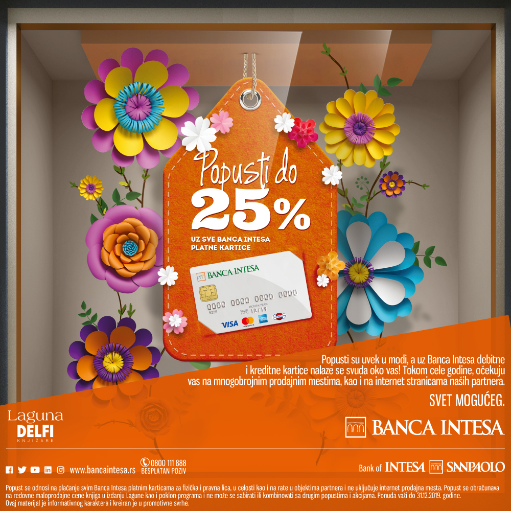 Ako još nemate Banca Intesa platnu karticu, toplo vam preporučujemo da odmah podnesete zahtev, jer vam ona, pored brojnih drugih pogodnosti, omogućuje korišćenje sjajnih popusta u knjižarama Delfi do kraja godine.