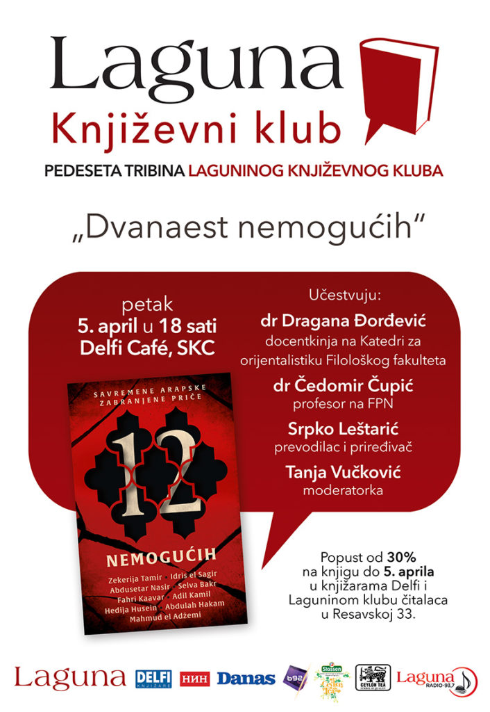 Priče devetorice buntovnih savremenih arapskih pisaca iz 7 arapskih zemalja sabrane su u antologiji „Dvanaest nemogućih“ koju je priredio i priče preveo sa savremenog standardnog arapskog jezika Srpko Leštarić. O ovoj knjizi ali i o arapskoj književnosti danas govorićemo na 50. jubilarnoj tribini Laguninog književnog kluba, u petak 5. aprila od 18 sati u knjižari Delfi u SKC-u.