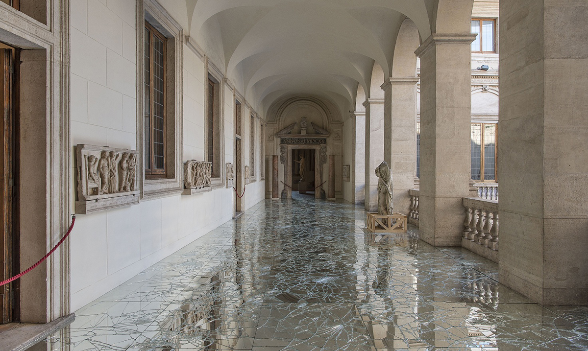 Instalacija “Koraci” predstavlja izuzetno uspešan koncept koji je realizovan na mestima od izuzetnog simboličnog značaja širom sveta, kao što su Cezarov forum u Rimu (2007), Nacionalna galerija moderne umetnosti (2011) i Galerija Akademije u Firenci (2012), Palata Altemps u Rimu (2018). Ovo delo se sastoji od niza ogledala koja su postavljena na podu velikog atrijuma na ulazu u Kinoteku. Unutrašnji zidovi zgrade, zajedno sa eksponatima Muzeja Jugoslovenske kinoteke, reflektuju se na površinu ogledala udvajajući se u njoj i stvarajući viziju prostora i vremena. Namera je da se stvori prostor koji je u stanju da izazove vizuelno iznenađenje i zadivljenost, kako je objasnio sam umetnik: “mi smo goloruki gledaoci prošlosti projektovani u vreme koje će doći i u kojem pod našom težinom nastaju pukotine“.