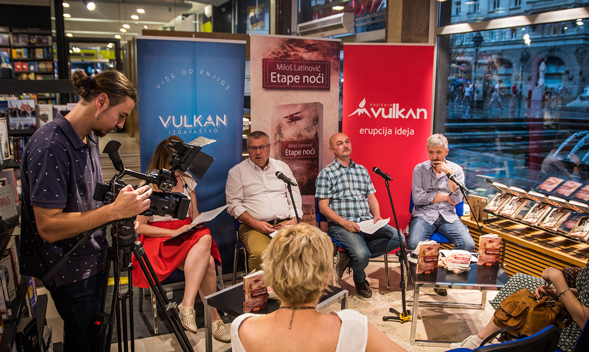 Ljubitelji savremene književnosti sinoć su u knjižari Vulkan na Trgu republike uživali u predstavljanju novog romana Miloša Latinovića koji nosi neobičan naziv – Etape noći. Osim autora, o knjizi su govorili Željko Jovanović, umetnički direktor Pozorišta na Terazijama, Predrag Radonjić, upravnik Narodnog pozorišta Priština, i Marija Radić, urednica Vulkan izdavaštva.