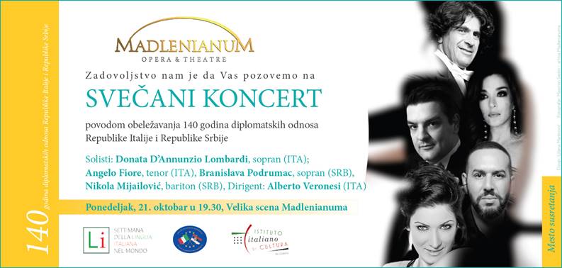 Najavljujući početkom sezone brojne muzičke događaje uz učešće vrhunskih umetnika Opera i teatar Madlenianum u saradnji sa Italijanskom ambasadom i Italijanskim institutom za kulturu organizuje svečani koncert 21. oktobra od 19.30 časova na Velikoj sceni Madlenianuma. Ove 2019. godine navršava se 140 godina od utemeljenja diplomatskih odnosa između Republike Italije i Republike Srbije, kao i deset godina od uspostavljanja strateškog partnerstva između Rima i Beograda, a ovaj koncert je deo manifestacije Italijanski na sceni koji se organizuje u okviru 21. Nedelje italijanskog jezika u svetu koja se obeležava bogatim kulturnim programom od 21. do 27. oktobra. Publika Beograda će moći da čuje najlepše italijanske arije i duete, i orkestarske deonice iz opera kompozitora Verdija, Pučinija, Rosinija, Leonkavala…u izvođenju gostiju iz Italije: Donate D’Anuncio Lombardi, soprana i Anđela Fjora, tenora, dok će boje naše zastave predstavljati Branislava Podrumac, sopran i Nikola Mijailović, bariton. Diriguje jedan od najangažovanijih italijanskih maestra, dirigent Alberto Veronezi, koji je nedavno otvorio sezonu Madlenianuma gala koncertom. Ulaznice za ovaj koncert mogu se nabaviti po cenama od 1.300, 1.500 i 1.700 dinara na blagajnama Madlenianuma u Glavnoj 32 i u Muzeju Zepter, Knez Mihailova 42, kao i on-line www.madlenianum.rs.