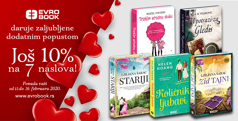 Za nas je februar mesec ljubavi (ne samo 14.), te smo odlučili da sve zaljubljene čitaoce u Evro Book izdanja obradujemo lepim popustom sa dodatnih 10 odsto (što je ukupno 30 odsto) na odabrane naslove, ljubavnih romana, po preporuci redakcije.