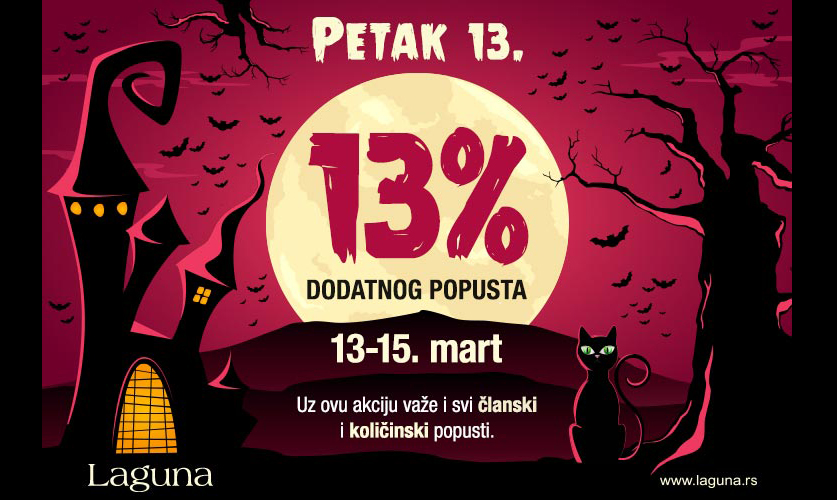 Petak 13. ove godine posetiće vas samo dva puta! A prvi je 13. marta, zato ne propustite priliku da iskoristite dodatnih 13% popusta na sve Lagunine knjige iz žanrova: horor, triler i fantastika.