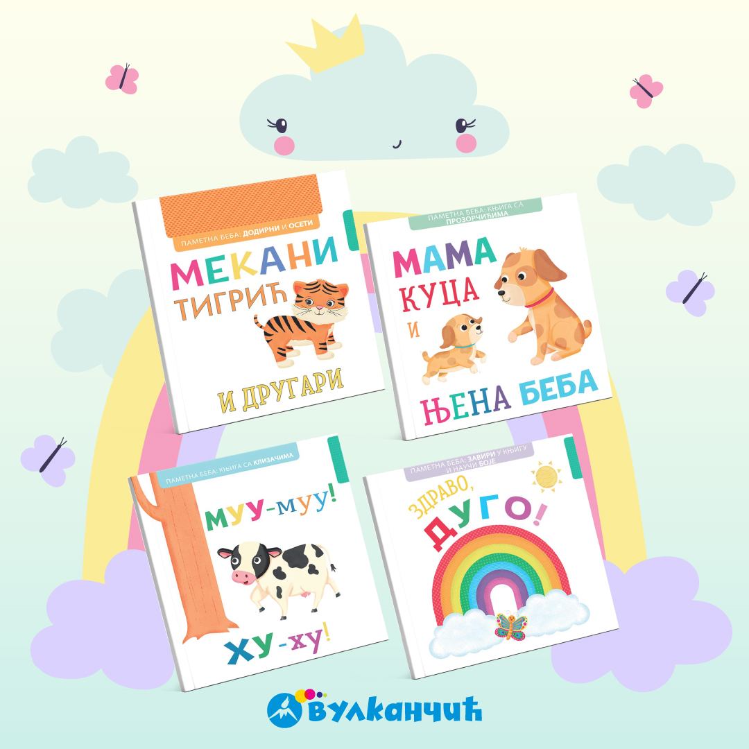 Edicija Pametna beba sadrži knjige koje podstiču razvoj govora, kreativnosti, senzornih i motoričkih sposobnosti, sticanje opštih znanja i usvajanje novih reči. Bilo da su u obliku torbice, sa prozorčićima, klizačima ili klasičnog dizajna, mališani će u njima uživati i zavoleti knjigu i čitanje. Zavirite u zanimljive stranice knjige Zdravo, dugo! i upoznajte najrazličitije boje. Da biste saznali gde se kriju mladunci, dovoljno je samo da podignete prozorčiće knjige Mama kuca i njena beba. Kad upoznate različite vrste životinja, pronađite skrivene klizače u knjizi Muu-muu! Hu-hu! i otkrijte kako se one oglašavaju. Četvrti naslov iz edicije, Mekani tigrić i njegovi drugari, sadrži divne ilustracije životinja. Različite teksture na svakoj stranici dodatno će dočarati životinjski svet, a mališani će moći svoje nove ljubimce i da dodirnu. Sve četiri knjige su edukativnog karaktera. Lepe ilustracije pomoći će deci da se na kreativan način upoznaju sa svetom oko nas i lako nauče nove reči i pojmove.