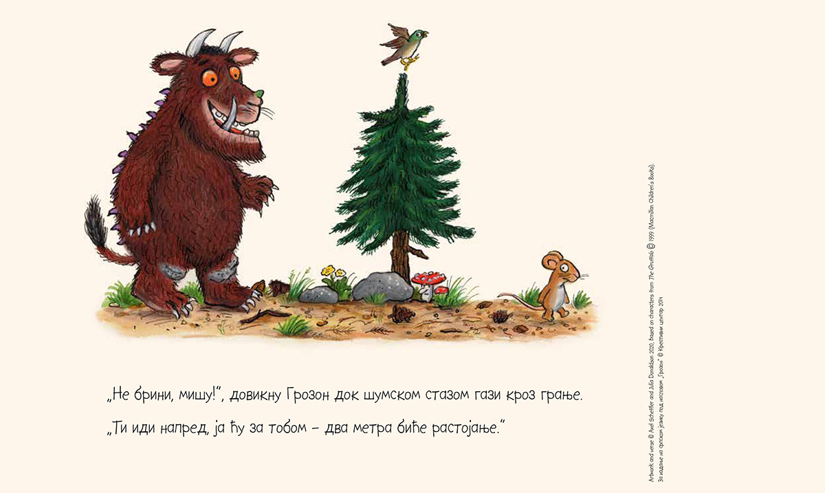 Knjige Džulije Donaldson i Aksela Šeflera prevedene su na mnoge jezike i omiljene su među mališanima širom sveta. Kreativni centar, ekskluzivni izdavač slikovnica Džulije Donaldson u Srbiji, od dvanaest Ilustracija i stihova na temu virusa korona preveo je na srpski jezik tri koje su vezane za slikovnice ranije objavljene kod nas: Grozon, Grozonovo dete i Prutko. Najpoznatija od njih svakako je slikovnica Grozon, koja je od 1999. godine, kada je prvi put objavljena, prevedena na više od 80 jezika širom sveta, prodata u više od 13 miliona primeraka, a po njoj su napravljene i pozorišne predstave koje se igraju na Vestendu i Brodveju. Knjiga je jedna od najprodavanijih i omiljenijih priča za laku noć u Velikoj Britaniji, a bibliotekari iz te zemlje izabrali su je za jednu od deset najboljih slikovnica svih vremena. Slikovnice Grozonovo dete i Prutko ne zaostaju u popularnosti za Grozonom, a njihove neobične i poučne priče, vešto prevedene u stihu na srpski jezik, postale su omiljeno štivo za mnoge najmlađe čitaoce kod nas.