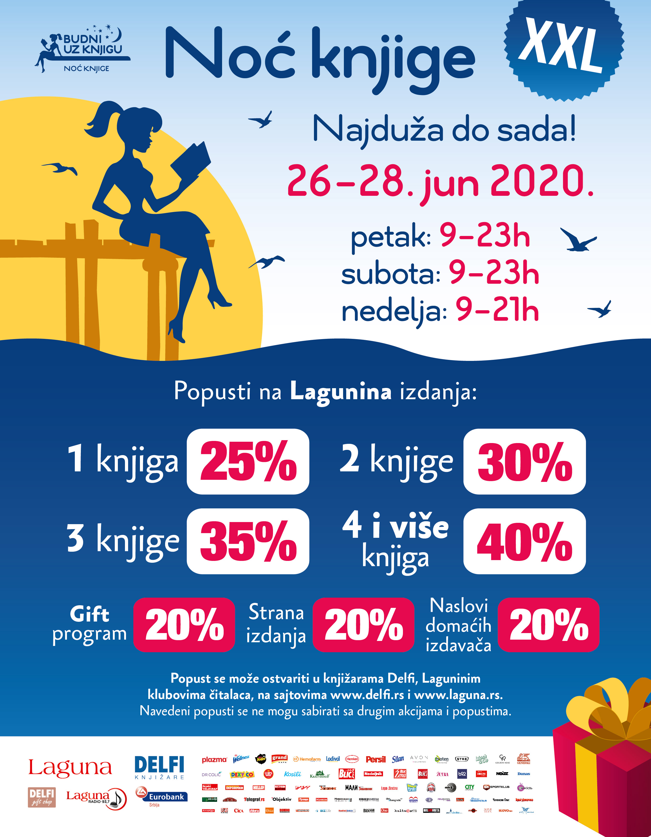 Noć knjige će se održati na čak 60 lokacija u knjižarama Delfi i Laguninim klubovima čitalaca u 30 gradova u Srbiji i regionu (Banjaluka, Bijeljina, Tuzla, Sarajevo, Podgorica, Nikšić).