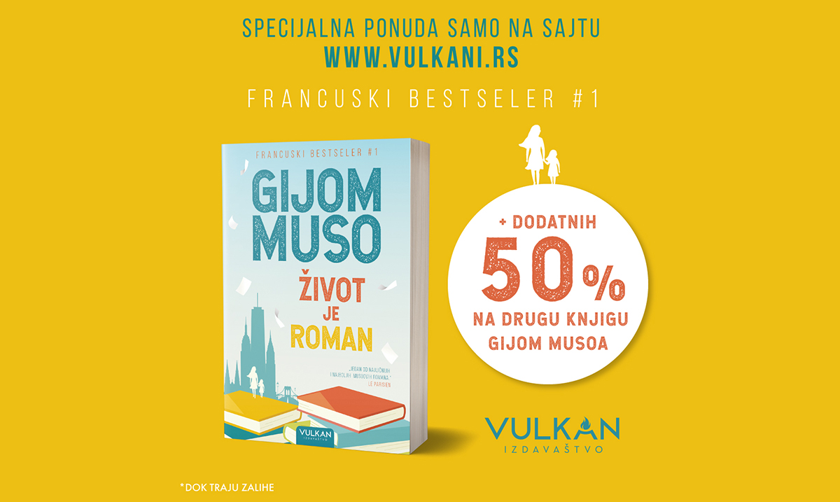 Kupovinom nove knjige Život je roman putem sajta www.vulkani.rs ostvarujete popust od 50% na redovnu cenu pri kupovini druge knjige ovog autora. O knjigama koje su na akciji možete se informisati putem linka https://www.vulkani.rs/l/9a80a910-0c96-4dc2-aaaf-9b193124dcff/promoGijomMuso.aspx.