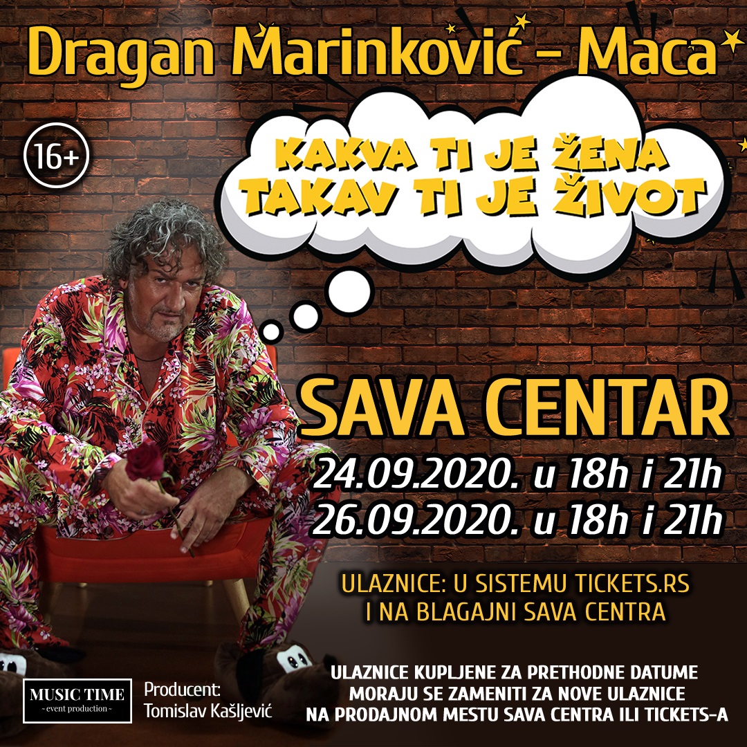 Posle više od šest meseci, vrata Sava Centra će se konačno otvoriti da se udobno smesti publika željna koncerata i predstava. Čast da prvi nastupi ima Dragan Marinković Maca sa svojom autorskom predstavom „Kakva ti je žena, takav ti je život“ koja je trebala da se odigra u martu, pa je zbog novonastale situacije prebačena za kraj septembra.