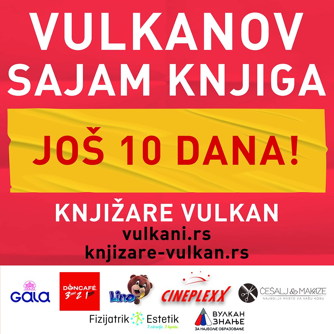 Još samo 10 dana do početka najveće kulturne manifestacije u ovoj godini – Vulkanovog sajma knjiga! Od 18. do 24. oktobra, u svim knjižarama Vulkan širom Srbije, kao i na sajtovima Vulkan izdavaštva (www.vulkani.rs) i knjižara (www.knjizare-vulkan.rs), bićete u prilici da kupite omiljene knjige po sajamskim cenama!