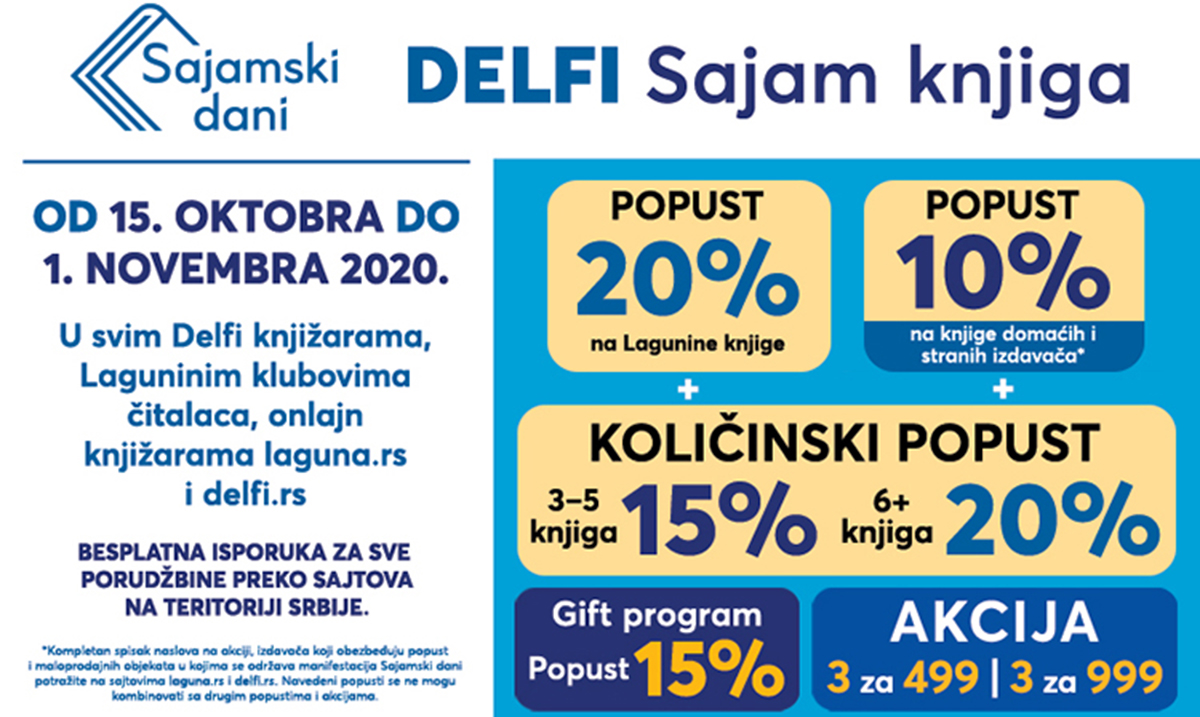 U svim Delfi knjižarama, Laguninim klubovima čitalaca u Srbiji i regionu, kao i na sajtovima laguna.rs i delfi.rs od 15. oktobra do 1. novembra 2020. očekuju vas sjajni popusti i akcije ta Lagunina izdanja.