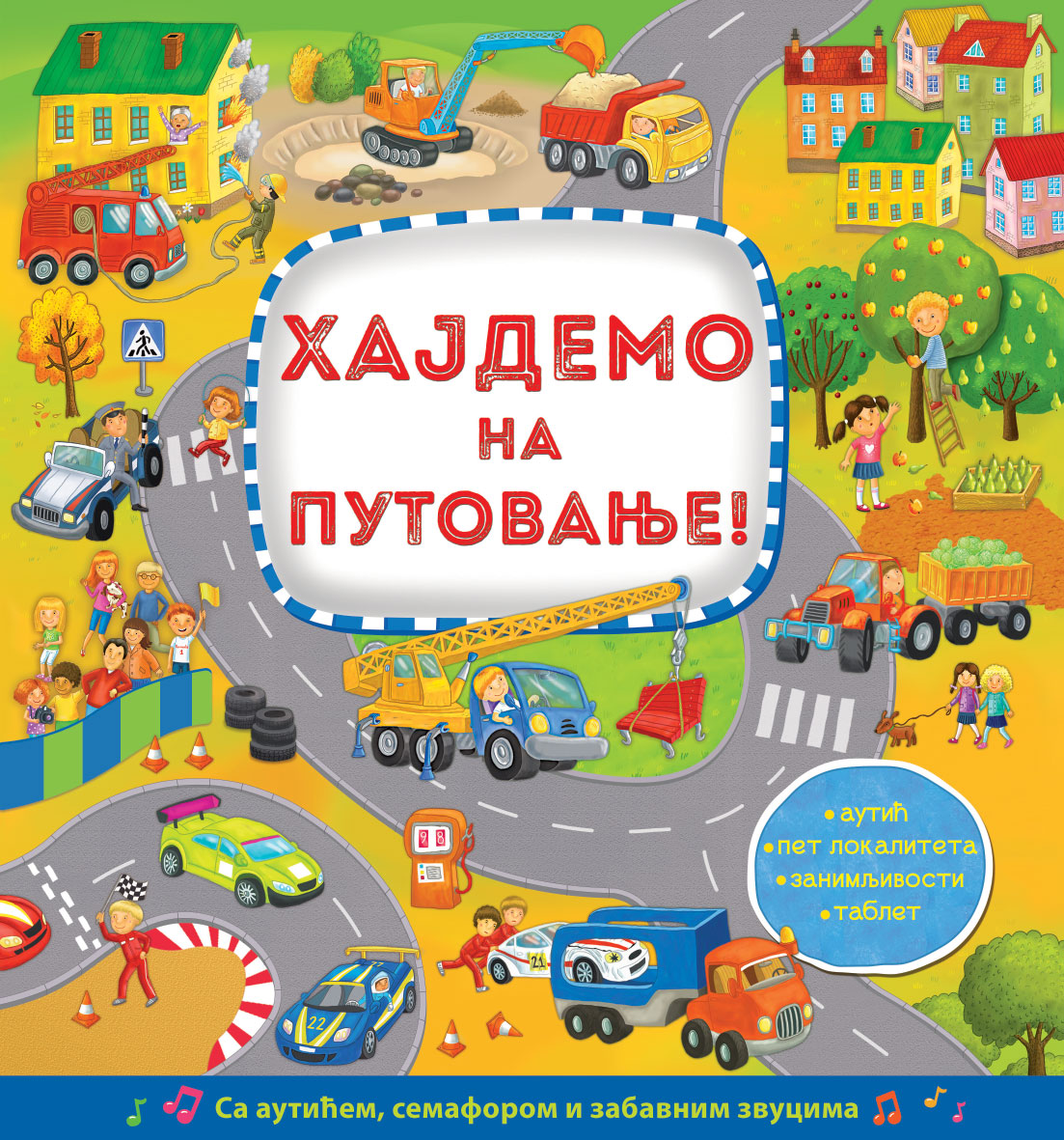 Hajdemo na putovanje nije obična knjiga! Pored prelepih ilustracija, ona sadrži autić i semafor, čak i tablet na kom se mogu slušati zabavni zvuci. Provozajte se kroz pet uzbudljivih lokaliteta i obogatite svoje znanje zanimljivostima o vozilima i životinjama.
