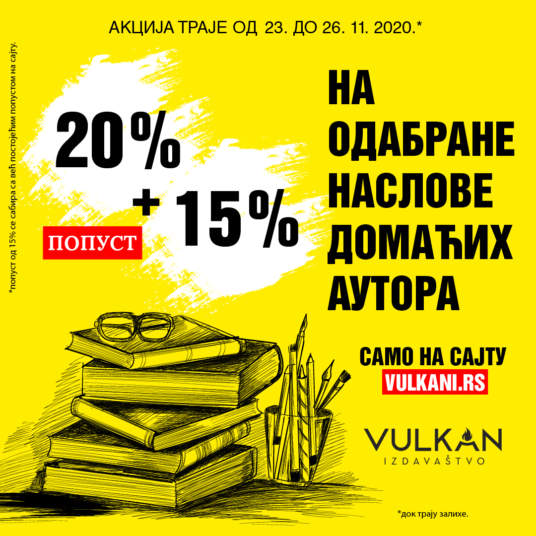 Ne propustite priliku da kupite knjige po specijalnoj ceni! Na već postojeći popust od 20% ostvarićete dodatnih 15% popusta na odabrana, renomirana dela klasične srpske književnosti, kao i romane savremenih pisaca u izdanju Vulkan izdavaštva! Akcija traje od 23. do 26. novembra, a dodatni popust se obračunava u korpi.