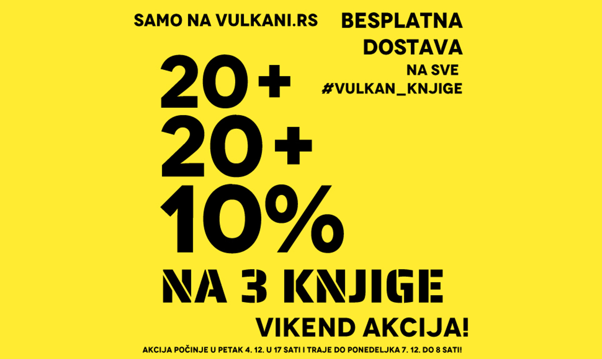 Samo na sajtu www.vulkani.rs danas, 4. decembra, u 17 sati počinje Vikend akcija, koja će trajati do ponedeljka, 7. decembra, do 8 sati! Sva izdanja Vulkana i Vulkančića moći ćete da kupite po neverovatnim cenama! Na već postojećih 20% popusta na sajtu, ostvarićete dodatnih 20%, a ukoliko odaberete tri ili više knjiga, obračunava se još 10% popusta! Popust se obračunava u korpi. To nije sve! Samo za vreme Vulkanove Vikend akcije, isporuka na teritoriji Republike Srbije biće besplatna!
