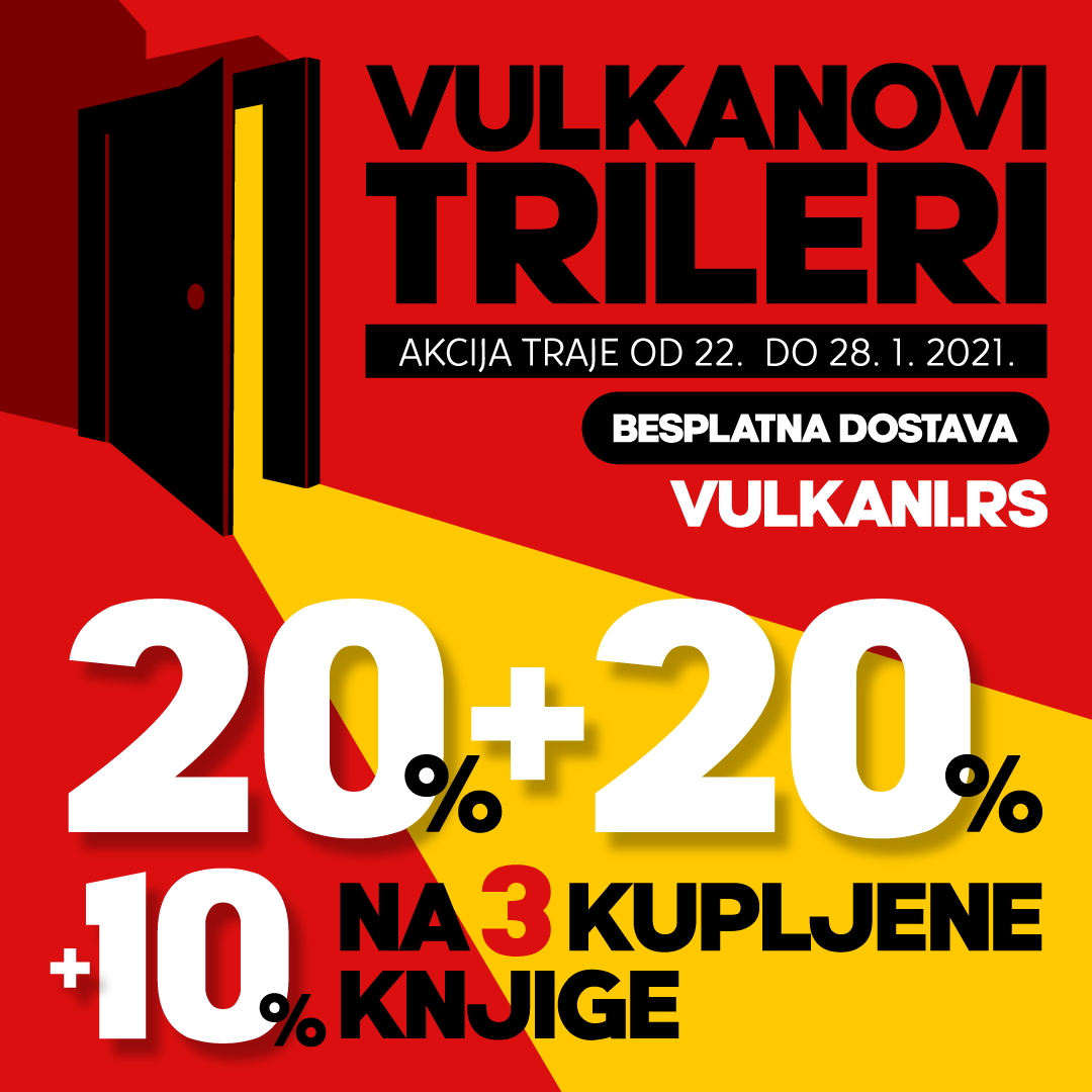 Samo na sajtu www.vulkani.rs, od 22. do 28. januara, najbolji trileri mogu se kupiti po neverovatno niskim cenama! Na postojećih 20% popusta na sajtu ostvarićete dodatnih 20%, a ukoliko se odlučite za tri ili više knjiga, obračunava se još 10% popusta! Popust se obračunava u korpi, a isporuka na teritoriji Republike Srbije za svaku kupovinu je besplatna!