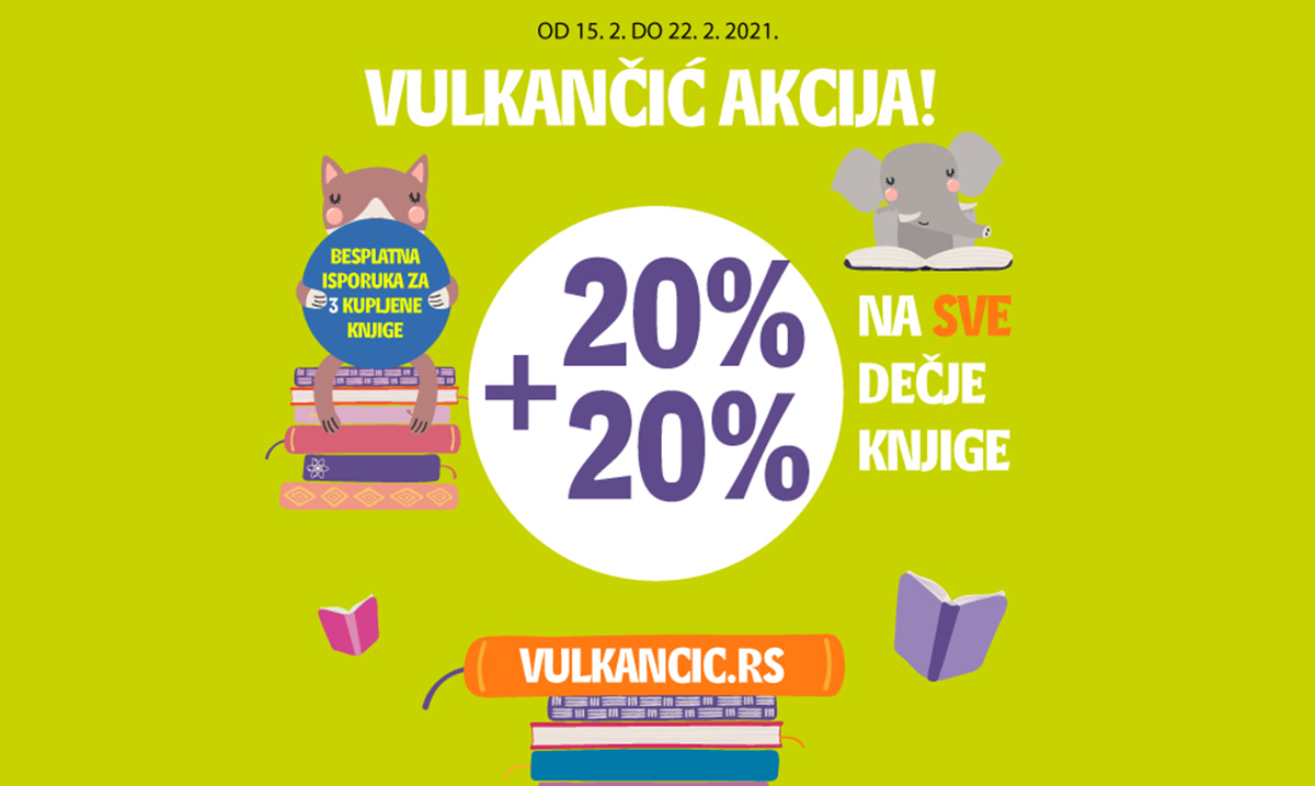 Od 15. do 22. februara, kupovinom putem sajta www.vulkancic.rs uz redovan popust od 20% ostvarićete dodatnih 20% popusta na sve knjige za decu! Na kupovinu tri i više knjiga, isporuka na teritoriji Republike Srbije je besplatna!