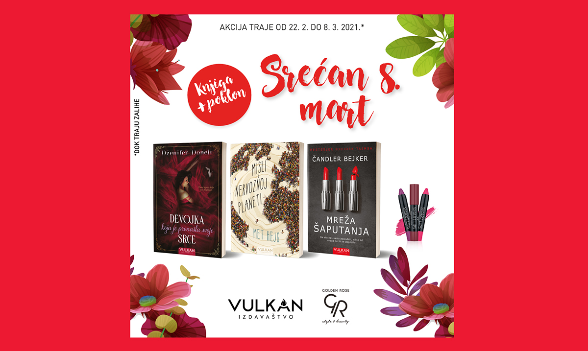 Akcija traje do isteka zaliha. Ljubav i poštovanje iskazujemo svakog dana, ali u susret prazniku, najvažnijim ženama u svom životu darujte posebno odabranu knjigu Vulkan izdavaštva i Golden Rose Smart Lips karmin.