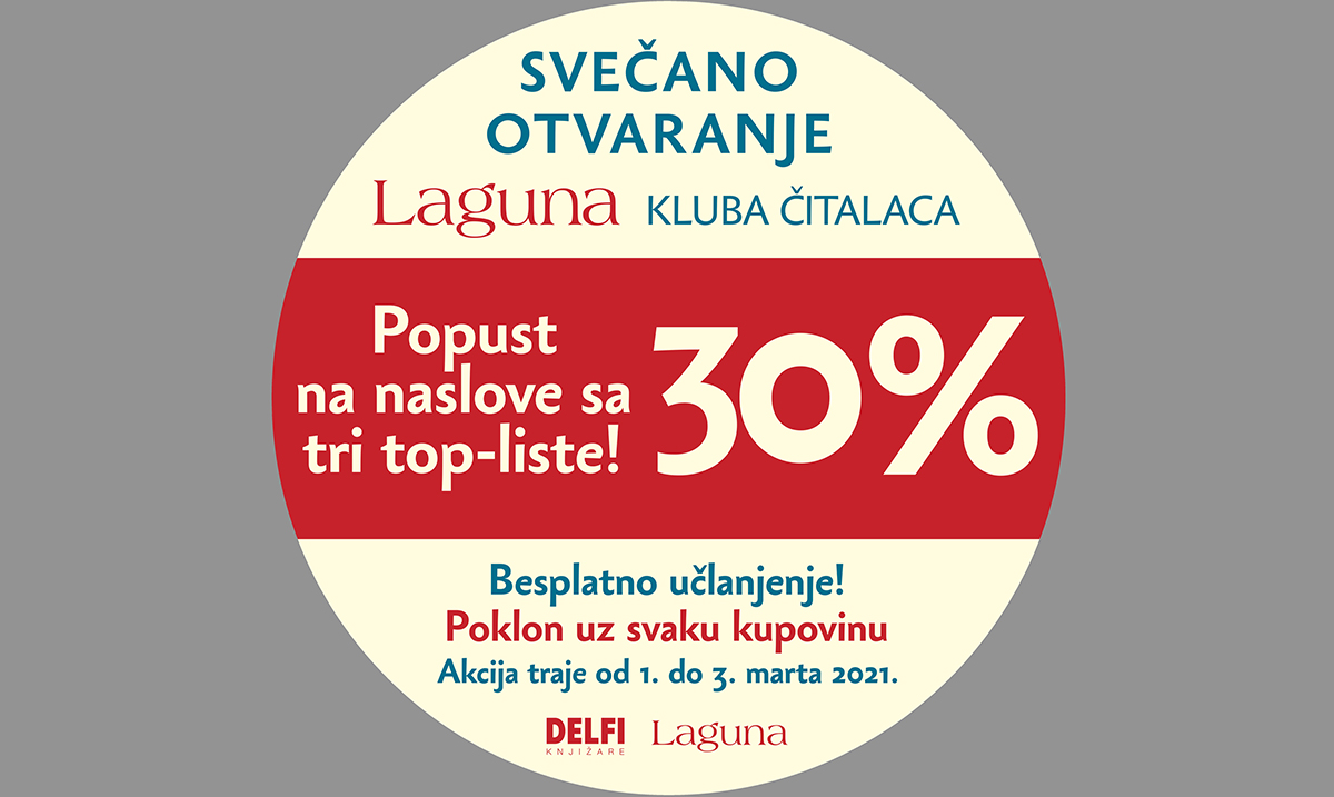 Kao poklon svim Novopazarcima, od 1. do 3. marta, učlanjenje u Lagunin klub čitalaca koji donosi sjajne popuste tokom cele godine biće besplatno, a knjige sa Laguninih top-lista beletristike, publicistike i Male Lagune biće snižene 30%, a spremili smo i poklone uz svaku kupovinu.