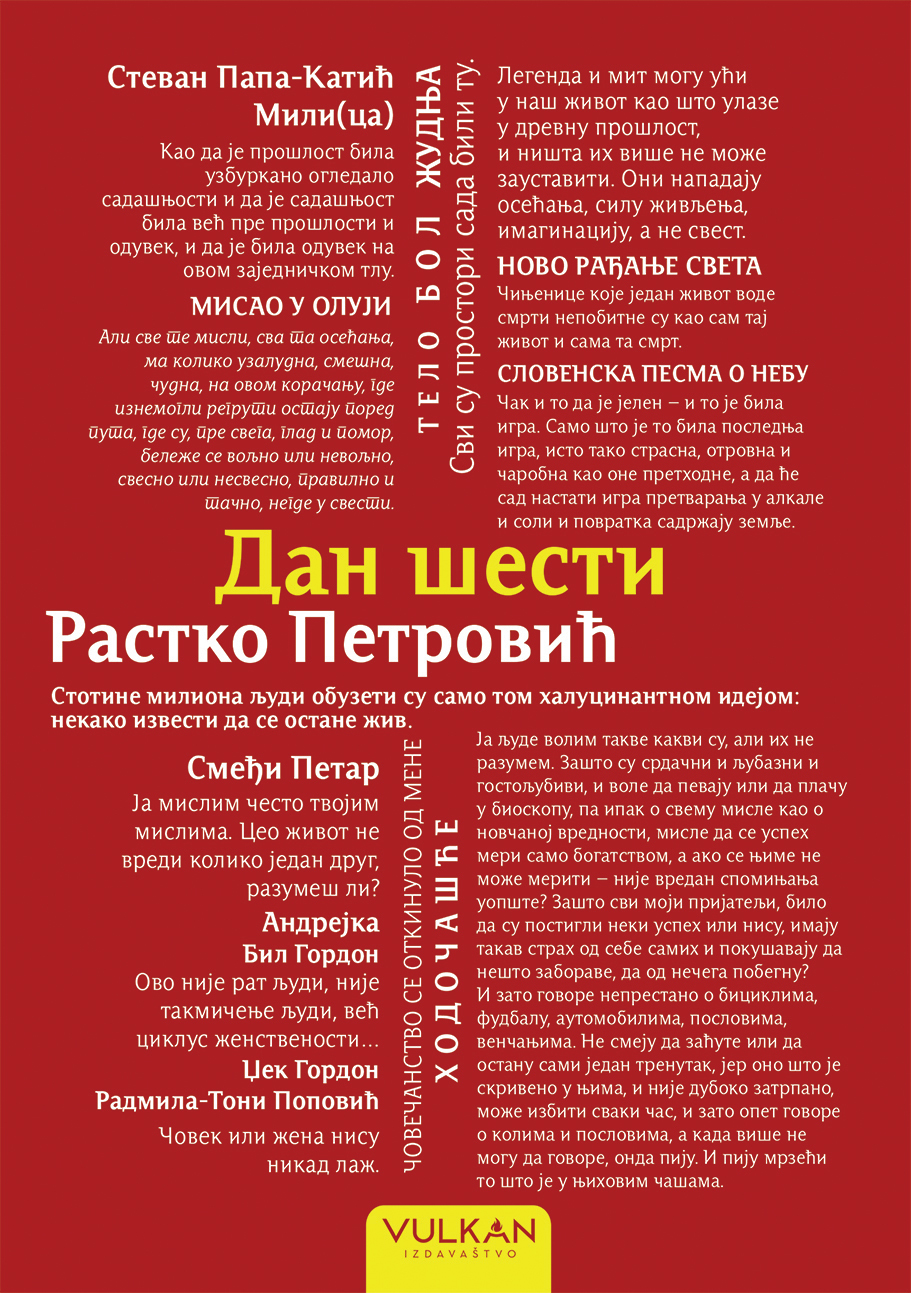 Vulkan izdavaštvo objavilo je monumentalno delo našeg poznatog pisca Rastka Petrovića Dan šesti. Roman čiji je naslov inspirisan biblijskom rečenicom o stvaranju čoveka: I bi jutro, i bi noć, dan šesti, jedinstven je u srpskom književnom opusu. Rastko Petrović, jedan od onih koji su prešli Albaniju 1915. godine, prikazao je do tada neviđenu sliku albanske golgote.