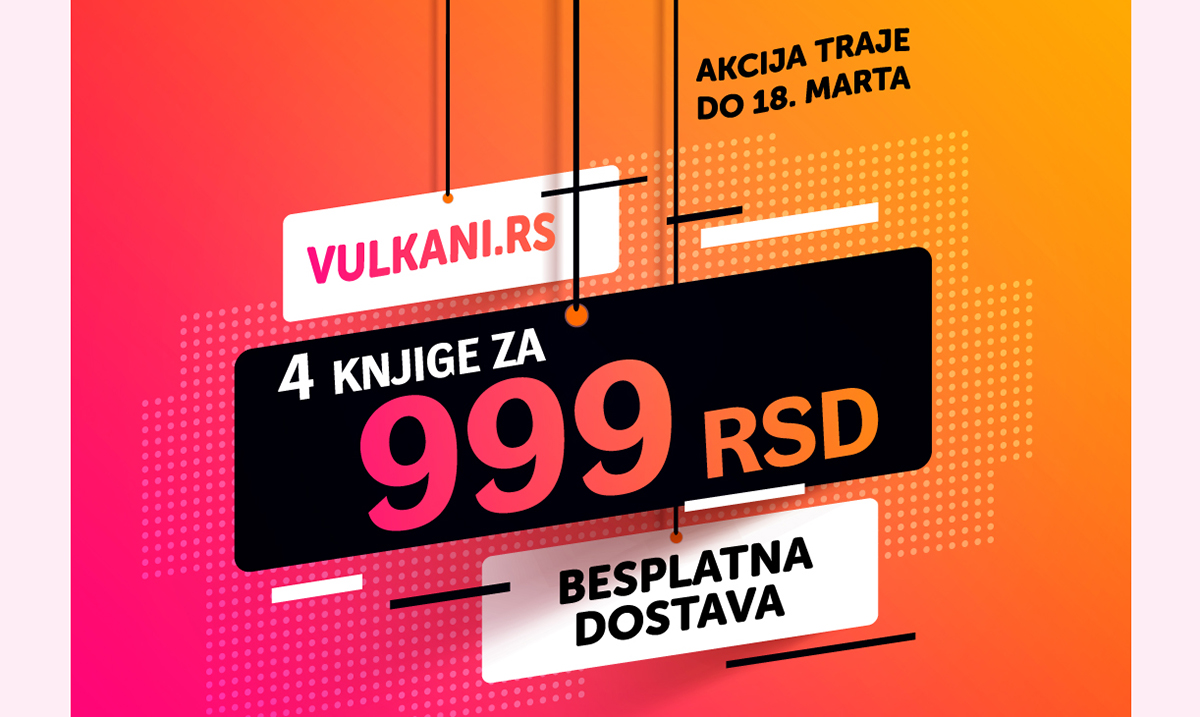 Samo na sajtu www.vulkani.rs do 18. marta možete kupiti 4 fantastične knjige po ceni od 999 dinara! Na spisku romana koji su na akciji od danas se nalazi još 30 naslova! Kompletan spisak knjiga koje su obuhvaćene akcijom možete pogledati putem linka. Kako bi kupovina bila uzbudljivija, lakša i bezbednija, za svaku porudžbinu u toku akcije dostava na teritoriji Republike Srbije je besplatna!