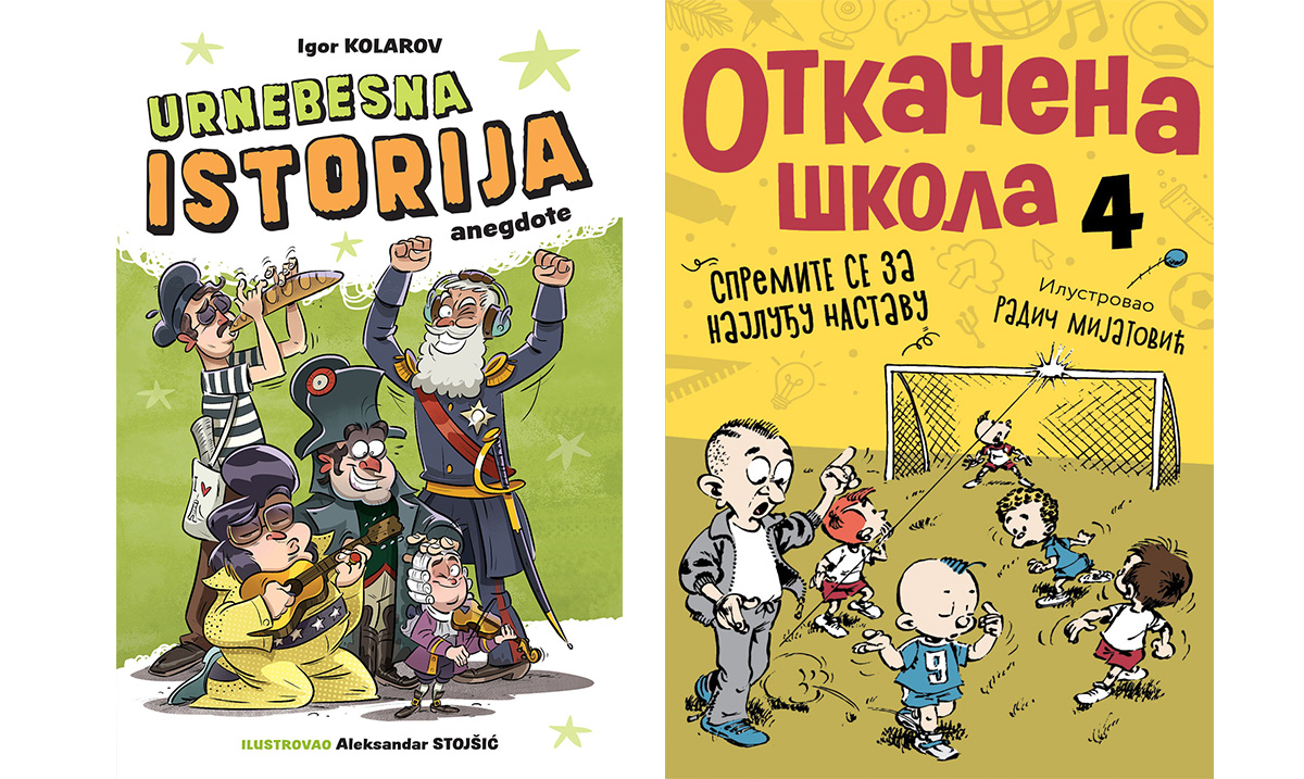 „Urnebesna istorija“ Igora Kolarova i „Otkačena škola 4“ u prodaji su od subote, 27. marta u svim Delfi knjižarama, Laguninim klubovima čitalaca, onlajn knjižari delfi.rs, kao i na sajtu laguna.rs.
