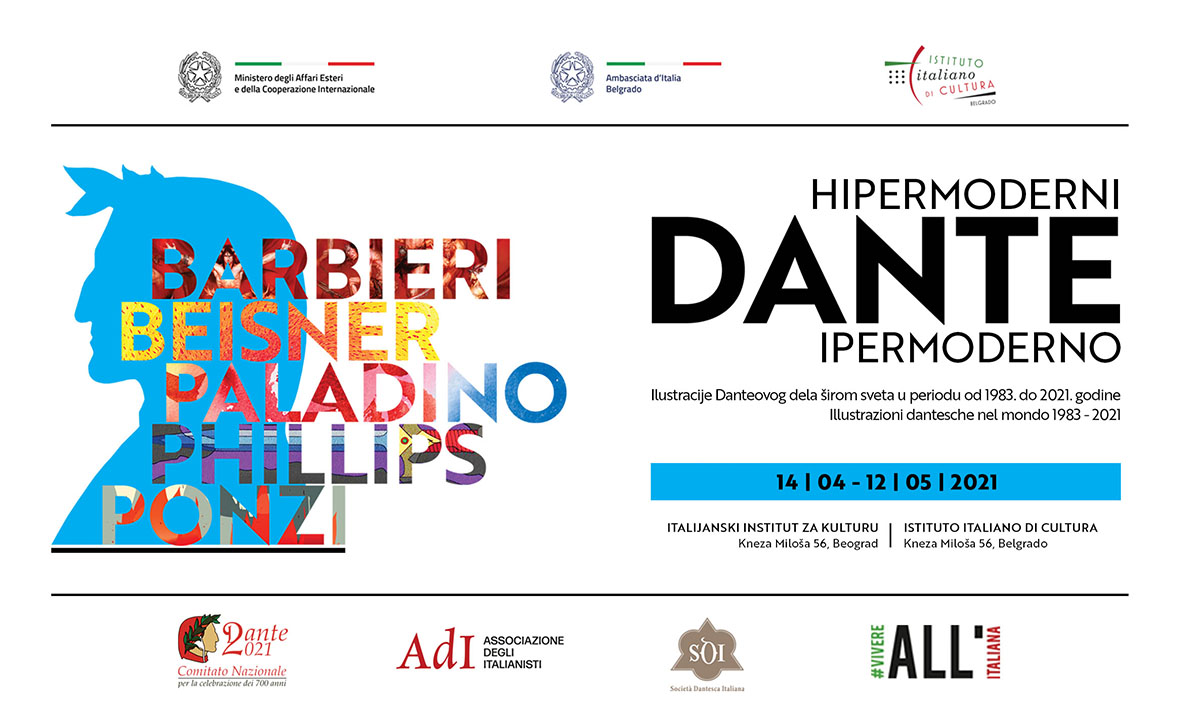 Povodom 700 godina od smrti Dantea Aligijerija, oca italijanskog jezika, Ambasada Italije u Beogradu i Italijanski institut za kulturu predstavljaju izložbu Hipermoderni Dante. Ilustracije Danteovog dela širom sveta u periodu od 1983. do 2021. godine koja se održava od 14. aprila do 12. maja u prostorijama Italijanskog instituta za kulturu u Beogradu. Izložba će biti otvorena u sredu, 14. aprila, u 18.30 časova a direktan prenos otvaranja može se pratiti na Jutjub kanalu Italijanskog instituta za kulturu u Beogradu. Izložba će biti otvorena za posetioce od 15. aprila do 12. maja 2021, od ponedeljka do petka od 10.00 do 19.00 časova, a u Beogradu je njeno premijerno izdanje. Nakon Beograda, biće predstavljena publici u Atini, Pragu, Moskvi, Madridu i Londonu.