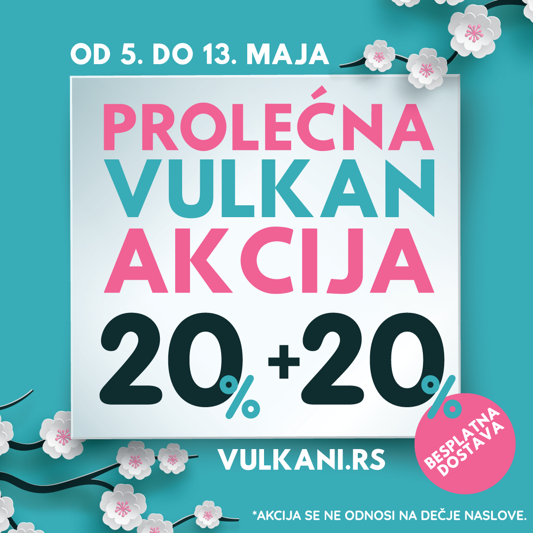Proleće je idealno doba za uživanje u dobroj literaturi i zato je Vulkan izdavaštvo za vas pripremilo sjajnu akciju. Kupovinom knjiga putem sajta www.vulkani.rs bićete u prilici da ostvarite izuzetne pogodnosti! Samo u periodu od 5. do 13. maja uz naš stalni popust od 20% ostvarićete dodatnih 20% popusta na sve knjige Vulkan izdavaštva, izuzev dečjih naslova. Sve knjige poručene tokom trajanja akcije stići će vam na kućnu adresu besplatno!