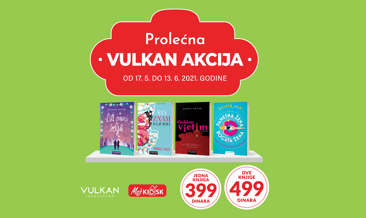 U periodu od 17. maja do 13. juna, u svim objektima Moj kiosk pronaći ćete specijalno odabrane naslove Vulkan izdavaštva, i to po izuzetnim cenama! Jednu knjigu kupićete po ceni od 399 dinara, a ukoliko se odlučite za dve knjige, platićete ih 499 dinara.