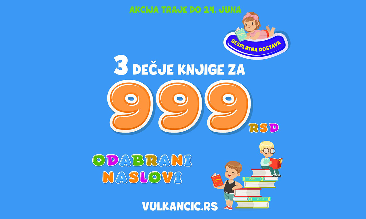 Započnite leto uz knjige koje je Vulkančić pažljivo odabrao za svoje najmlađe čitaoce. U periodu od 18. do 24. juna kupite odabrane naslove putem sajta www.vulkancic.rs i iskoristite specijalne pogodnosti! Za kupovinu tri naslova sa spiska cena će biti 999 dinara, a dostava na kućnu adresu besplatna! Kompletan spisak dečjih naslova koji su obuhvaćeni akcijom pronaći ćete na ovom linku.