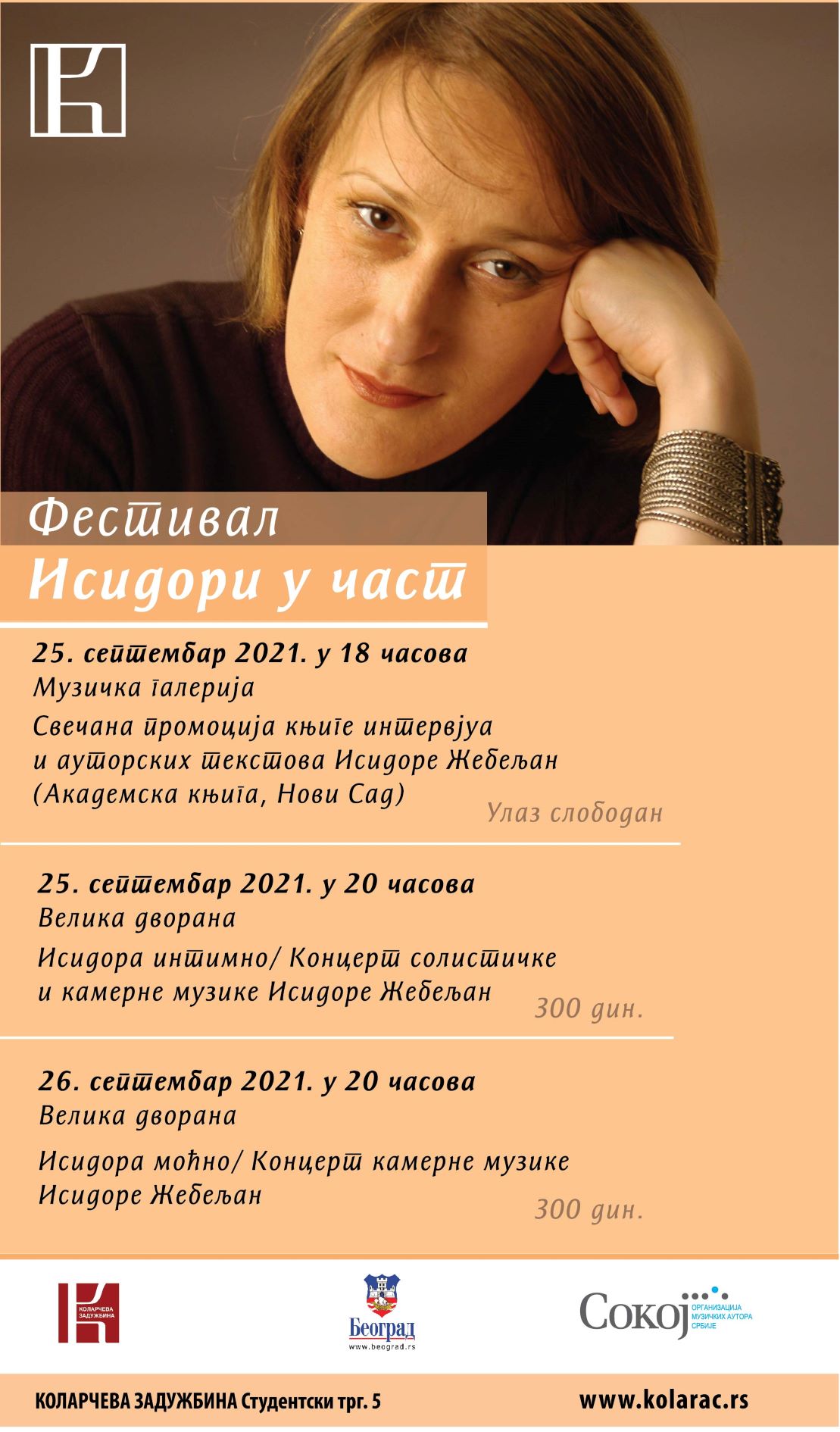 Festival posvećen Isidori Žebeljan – Isidori u čast biće održan u subotu i nedelju, 25. i 26. septembra 2021, u Zadužbini Ilije M. Kolarca.