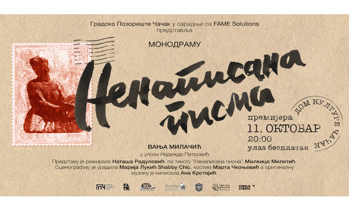 U ponedeljak, 11. oktobra, na velikoj sceni Doma kulture Čačak biće premijerno izvedena monodrama „NENAPISANA PISMA “ u znak obeležavanja 148 godina od rođenja naše velike slikarke Nadežde Petrović. Monodrama u izvođenju glumice Vanje Milačić jedan je od pratećih programa izložbe “Zlatnom rukom i srebrnim srpom” Umetničke galerije Nadežda Petrović u Čačku, koja je u saradnji sa Etnografskim muzejem u Beogradu, predstavila zbirku etnografskih predmeta iz Nadeždinog pariskog ateljea.