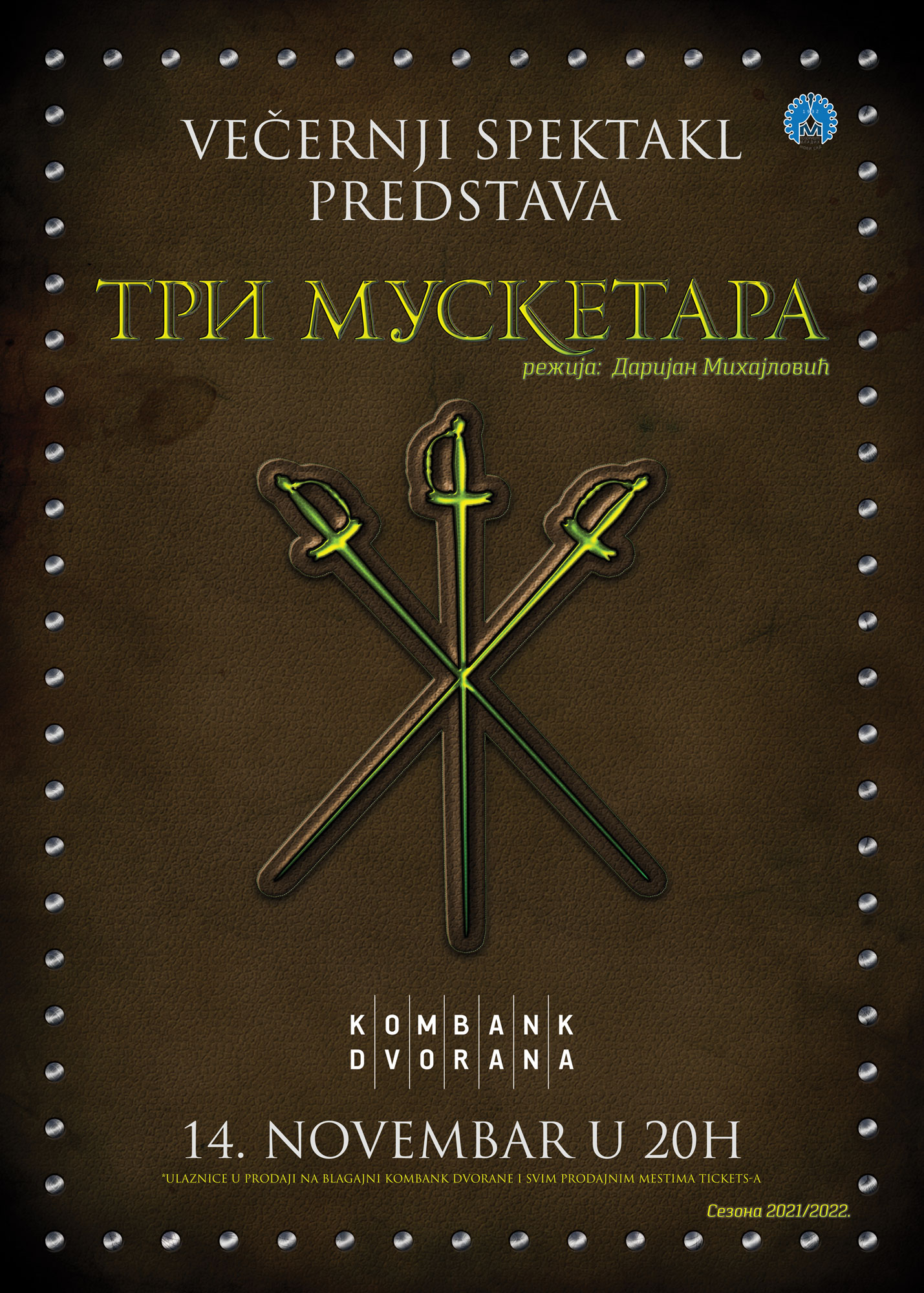 Potpuno nova verzija dobro poznate bajke „Tri musketara“ u okviru glumačkog i muzičkog spektakla, autora Aleksandre Glovacki, a u režiji Darijana Mihajlovića, glumačke trupe „Pozorišta mladih“ u Novom Sadu, biće odigrana prvi put na sceni Kombank Dvorane 14. novembra u 20h.