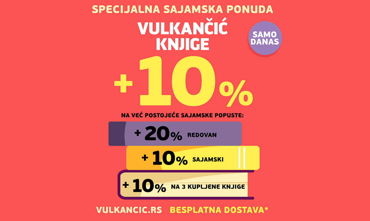 Dečja izdanja Vulkančića moći ćete da kupite putem sajta vulkancic.rs po neverovatnim cenama. Na redovni popust na sajtu od 20% odobravamo još 10% popusta, a na tri i više kupljenih knjiga ostvarujete dodatni popust od 10%. Ali to nije sve! Na postojeće sajamske popuste očekuje vas dodatni popust od 10%. Popust se obračunava u korpi, a samo tokom akcije, za kupovinu knjiga putem sajta dostava na kućnu adresu na teritoriji Republike Srbije je besplatna.