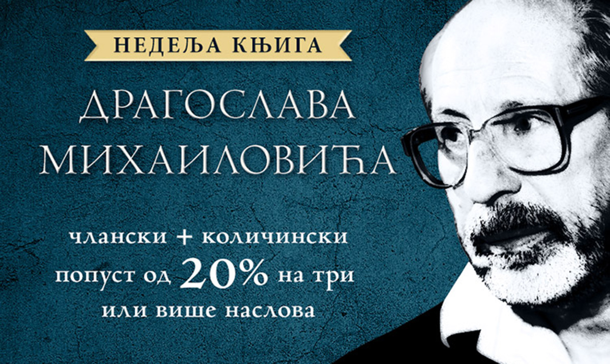 Do 23. januara pružamo vam lepu priliku da kućnu biblioteku obogatite delima Dragoslava Mihailovića. Knjige „Uvođenje u posao“, „Jalova jesen“, „Preživljavanje“, „Kad su cvetale tikve“ i druge tokom Nedelje knjiga Dragoslava Mihailovića možete nabaviti po ceni sniženoj za 20 odsto prilikom kupovine tri ili više naslova.